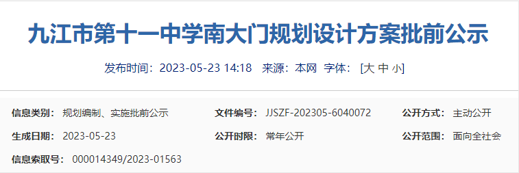 5月23日,九江市自然资源局网站发布九江市第十一中学南大门规划设计方案批前公示。