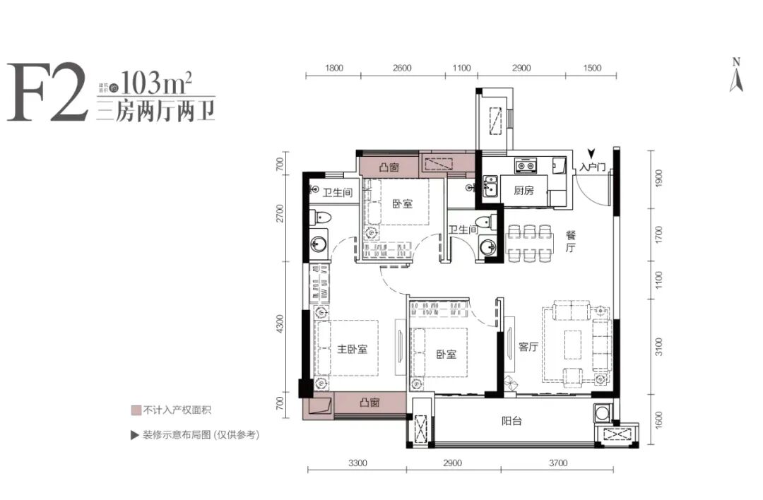 建面约103㎡三房,拓展面积约4.9㎡。三开间全朝南,格局方正,客厅自然衔接宽约6.6米“风景长廊式”的双开间阳台,让室内全天候采光。