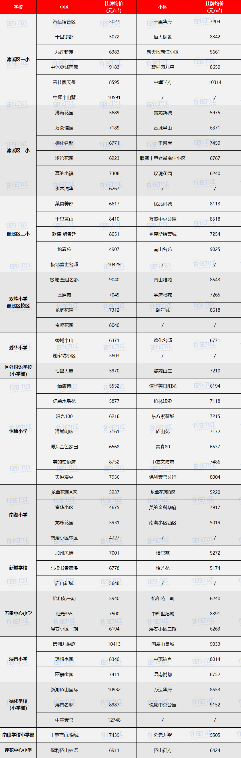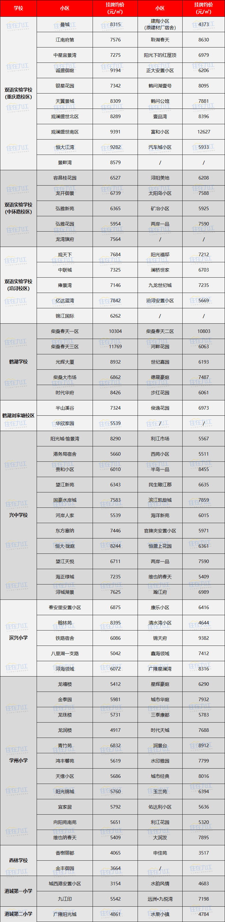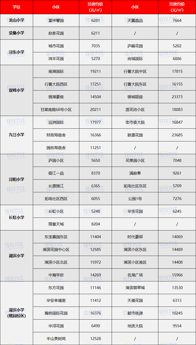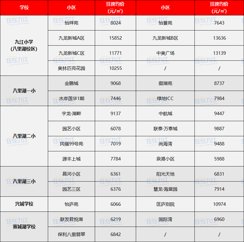 根据2023年九江教育公布的最新公办小学学区范围,此次我们统计了浔阳区、濂溪区、开发区、八里湖新区的部分学区房挂牌均价,想要看学区房价格的家长,可以看下。