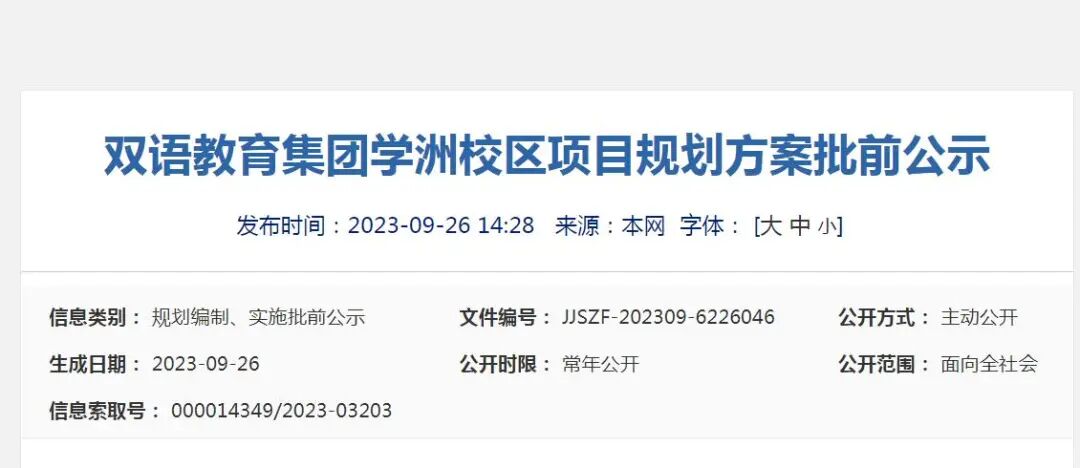 公示内容:双语教育集团学洲校区项目位于九江经开区后纬路以南、一马路以西马路以东地块。总用地面积19031.56平方米(约28.55亩),其中南区5833.76(约8.75亩)为此次规划建设用地,总建筑面积:10948.68平方米。容积率:1.20,建筑密度:38.9%,绿地率:8.3%。北区13197.80(约19.8亩)为远期规划。该地块用地性质为A33中小学用地。所报规划方案的相关指标均符合控制性详细规划和国家法律法规相关要求。