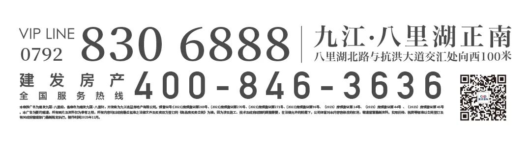 建发九颂·八里府为本案推广名,建发九颂·八里轩为本案备案名,开发商为九江兆益房地产有限公司。预售证号:(2021)房预售证第269号、(2021)房预售证第270号、(2021)房预售证第271号、(2022)房预售证第96号、(2023)房预售证第 14号。部分图片、文字等内容版权归原作者所有,本文只作为引用,如原作者表明身份要求本公司停止使用该素材,请及时与本公司联系删除。项目相关配套设施、场所运营及各功能区规划以交付使用状态为准,此资料仅供展示及参考。本资料户型图仅为户型结构示意,所涉及的建筑面积、装修平面效果、图示使用方式、图片文字数据或其他资料仅供参考,不作为交房标准及邀约承诺。相同户型单元,在不同楼栋、不同楼居、不同位置,面积、阳台结构、局部结构及外立面可能存在差异,实际交付以政府最后批准之法律文件及买卖双方签订的《商品房买卖合同》为准。因设计、施工、技术、政府政策、政府规划、政府规定的调整需要以及开发商未能控制的原因,项目存在调整产品种类、形式的可能,本公司保留对户型修改或优化的权利,敬请留意最新资料。置业计划内所列示各项信息仅供参考,不作为开发商价格及收费承诺,实际价格、税费等标准以合同签订及有关政府管理部门最新规定执行。贷款等相关信息仅作示意之用,具体标准以金融机构最终授信要求及审批结果为准。受制作批次、市场变化等限制条件或开发商不可控制的原因,开发商在保证以上建设质量的情况下可能进行更换品牌,如有变动,恕不另行通知。本宣传不对学区及入学条件做任何承诺,学校划分及入学条件以政府相关部门最终批准方案为准。本条微信内容为售楼宣传资料,相关内容不排除因政府相关规划、规定及开发商未能控制的原因而发生变化,文中所用图片、文字、视频、数据、位置示意、周边环境、交通、教育、商业及其他配套设施的介绍等仅作为参考之用,并非最终方案,不作为邀约或承诺。九江兆益房地产有限公司享有本活动最终解释权。建发房产全国服务热线 400-846-3636。本资料所发布的内容为2023年12月12日前的信息,敬请留意最新资料。