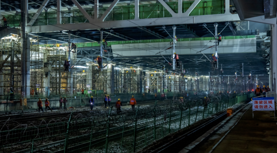 经过连续4天的铁路最高等级一级封锁施工,12月21日凌晨5时20分,安九铁路庐山站东站房高架钢结构成功完成精准落梁,标志着世界首例大型站改钢结构整体跨线落梁施工顺利完成。