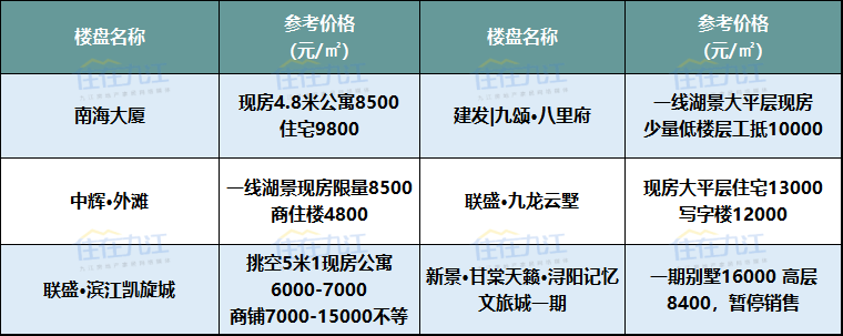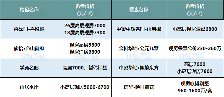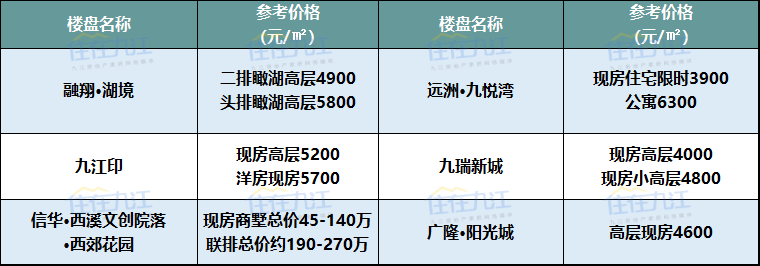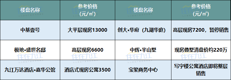 注:以上板块划分标准以九江规划局2017年公布的片区规划方案为准、以上项目价格为网络报价及调研数据,具体以售楼部为准。