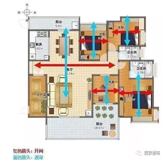 进深与开间之比一般介于1:1.5之间较好。进深过大,开间过小,会影响户型采光通风,房间内会显得比较暗;而进深偏小,开间过大不利于房间保温,浪费能源。比较方正的户型能做到采光通风与保温两者间的平衡。